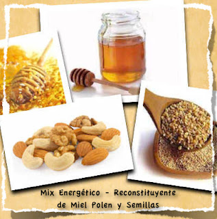 40% de Miel (mejor si es organica). -40% de Polen - Dos cucharadas de semillas previamente hidratadas de la noche anterior, (puede hacer una mezcla de las que mas le guste, lino, sesamo, girasol pelado, chia, amapola, un poquito de cada una) - Un puñado de nueces y almendras u otros frutos secos, tambien previamente hidratadas para que se activen sus procesos enzimaticos. - Una cucharada de Jenjibre en polvo. - Dos cucharaditas de canela en polvo.
